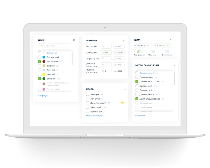 Эффективные и функциональные фильтры по цвету, типу, помещению, стилю интерьера, количеству лампочек - и многие другие. С их помощью можно легко выделить интересующий ассортимент - в условиях невероятного выбора из более чем 120 000 моделей это крайне актуально!