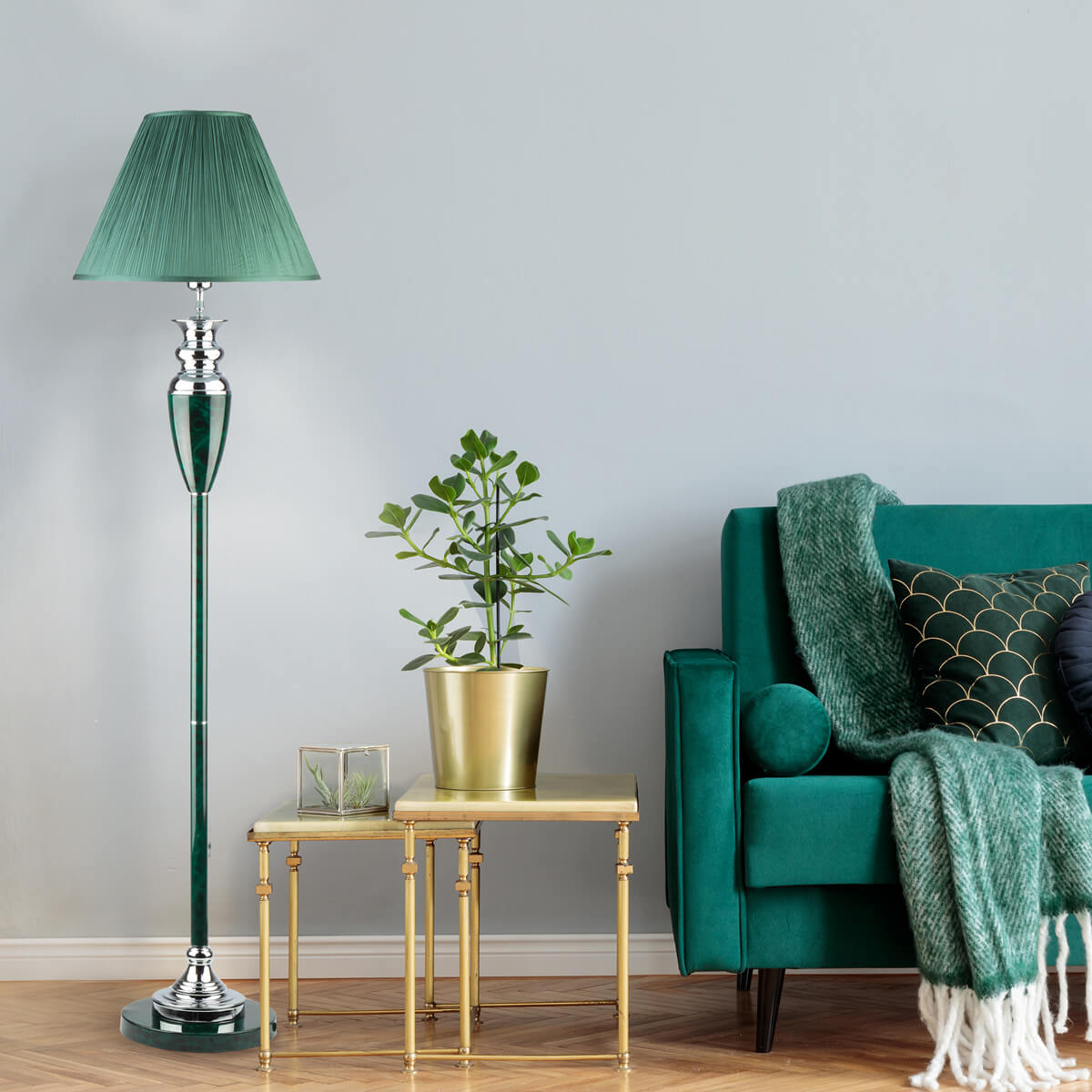 Роскошная модель 009/1T GR от российской компании Eurosvet относится к коллекции Majorka и отлично подойдет для установки на пол в гостиной, оформленной в стиле арт-деко. Торшер Eurosvet 009/1T GR с плафонами-конусами осветит помещение площадью 4 кв. м. Производитель Eurosvet рекомендует использовать для устройства лампы накаливания с цоколем E27 и мощностью 60 W. Прибор произведен с использованием материалов: металл и ткань. Основным цветом товара является зеленый и серебристо-стальной. Торшер 009/1T GR продается по цене 10500 руб. Торопитесь сделать заказ в интернет-магазине ВамСвет.