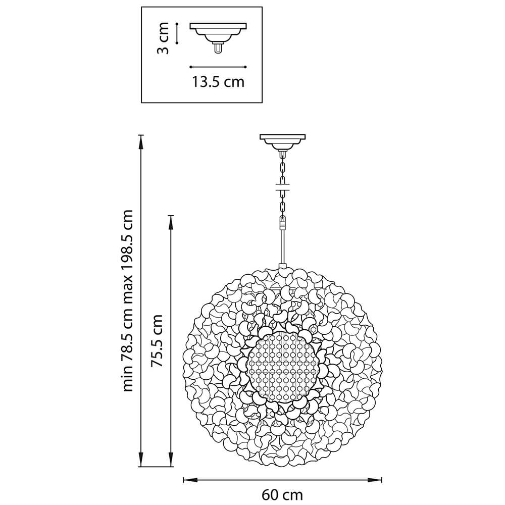 - Технические характеристикиОсновныеРазмерыВысота, мм755Диаметр, мм600Высота встраиваемой части, мм30Диаметр врезного отверстия, мм135Длина подвеса, мм600Вес, кг10.2ЛампыТип цоколяПосмотреть другие товары