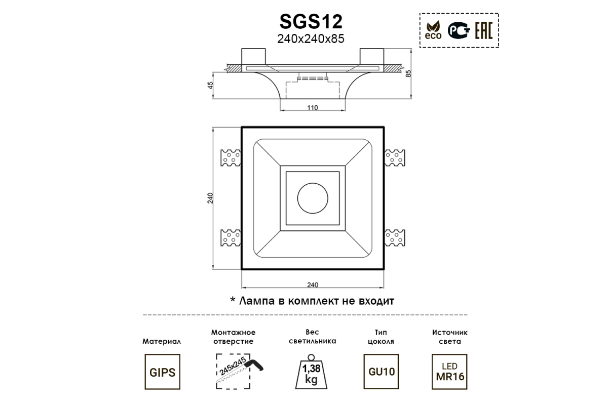 данной категорииОсобенностьМожно окрашивать в любой цветРазмерыШирина, мм240Высота, мм85Длина, мм240Высота встраиваемой части, мм40Вес, кг2ЛампыТип цоколяПосмотреть другие товары